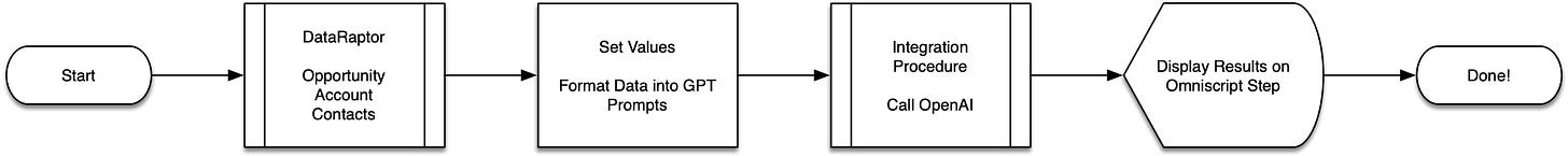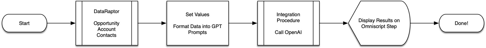 The OmniScript orchestrates the process, and starts by calling a Data Raptor to retrieve key information about the opportunity. It displays some of that data to the user, but mostly uses the data as part of our prompt to feed OpenAI. After OpenAI returns its recommendations, they are displayed to the user, who slaps their forehead and shouts “why didn’t I think that?”1