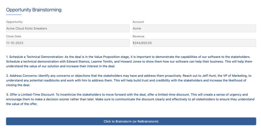 But this is often a tactical kind of thing, and at times what reps need is more strategic, more akin to account planning. For today’s post, I offer you something in that vein, a brainstorming application of AI where it provides not final content, but some ideas to help a rep advance a deal if they’re feeling stuck.